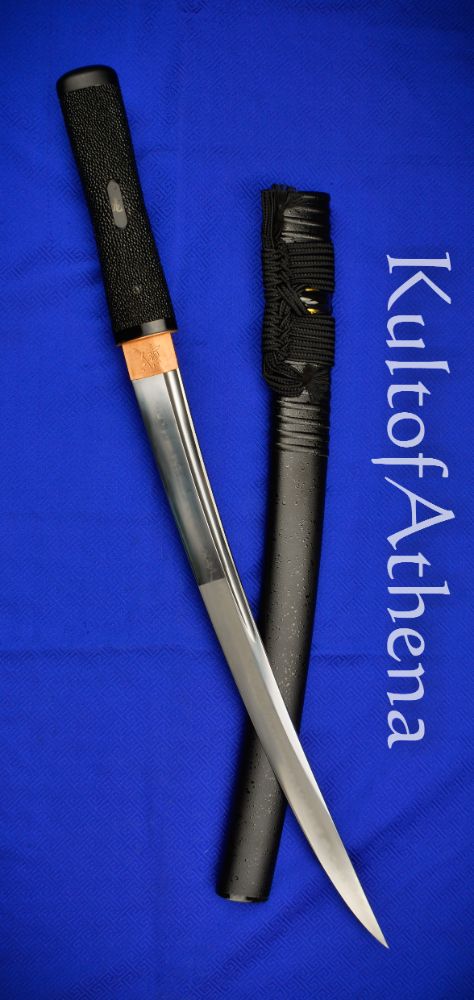 Let us introduce you the Gokudō Shōtō shirasaya sword. As its name describes; this one truly is wicked and an extremely intensive weapon. Dressed in imposing all black aikuchi koshirae but with longer and heftier blade than a conventional aikuchi. With its nagasa featuring a kissaki longer than half of the blade, this sword is set to yield exceptional performance. Despite the sturdy nagasa, the Gokudō Shōtō is balanced for battle ready and will surprise any swords enthusiastic by its swift and striking fast handling. Whether you are martial arts enthusiastic, a collector or simply like damn fine swords, this is your pick.
