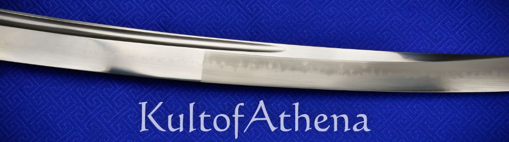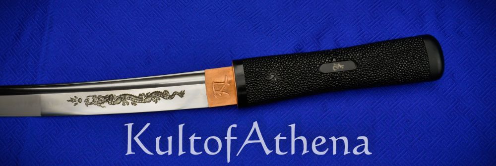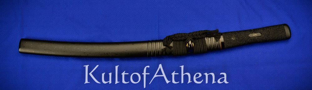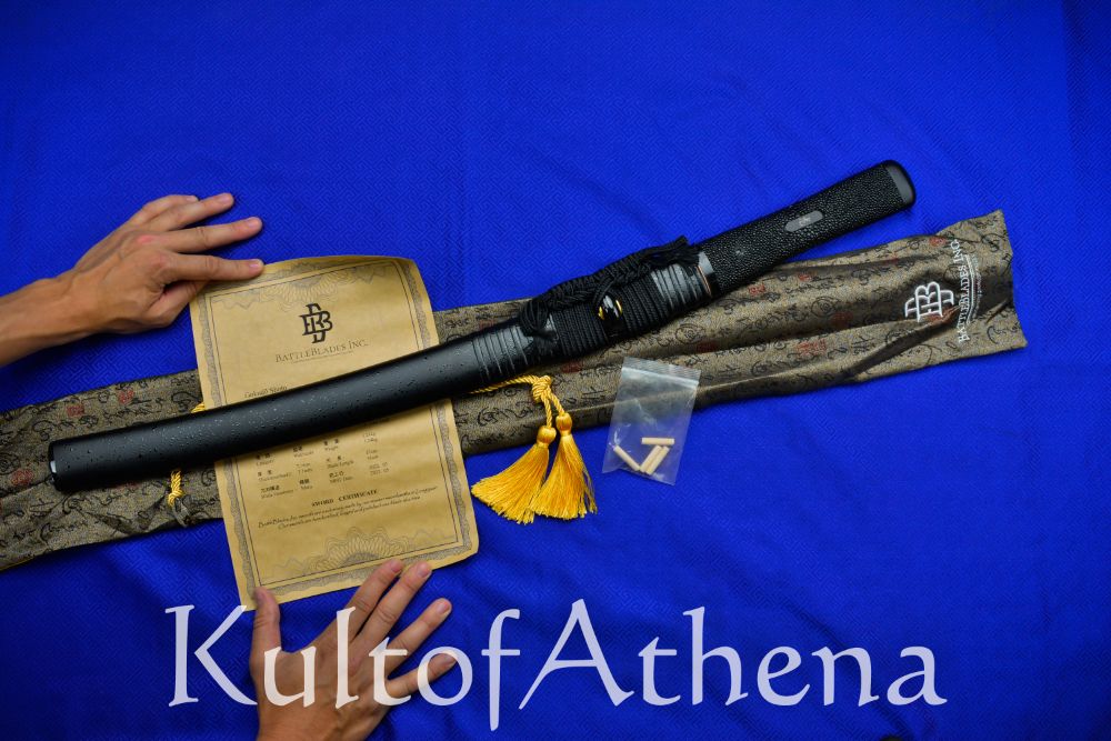 A solid hardwood shirasaya-aikuchi style tsuka is fully wrapped with black samegawa rayskin, ensuring a maximum grip. The custom-made copper habaki features hand engraved japanese kanji letters that stand for BattleBlades. Hand finished fitted fuchi and kashira are made from blackened iron. All black, water-drop lacquered saya features genuine buffalo horn kojiri, koiguchi and kurikata, finalized with black premium grade silk sageo for a dashing entirety. Comes in an embroidered BattleBlades Inc. silk sword bag with a serial numbered certificate of authenticity.