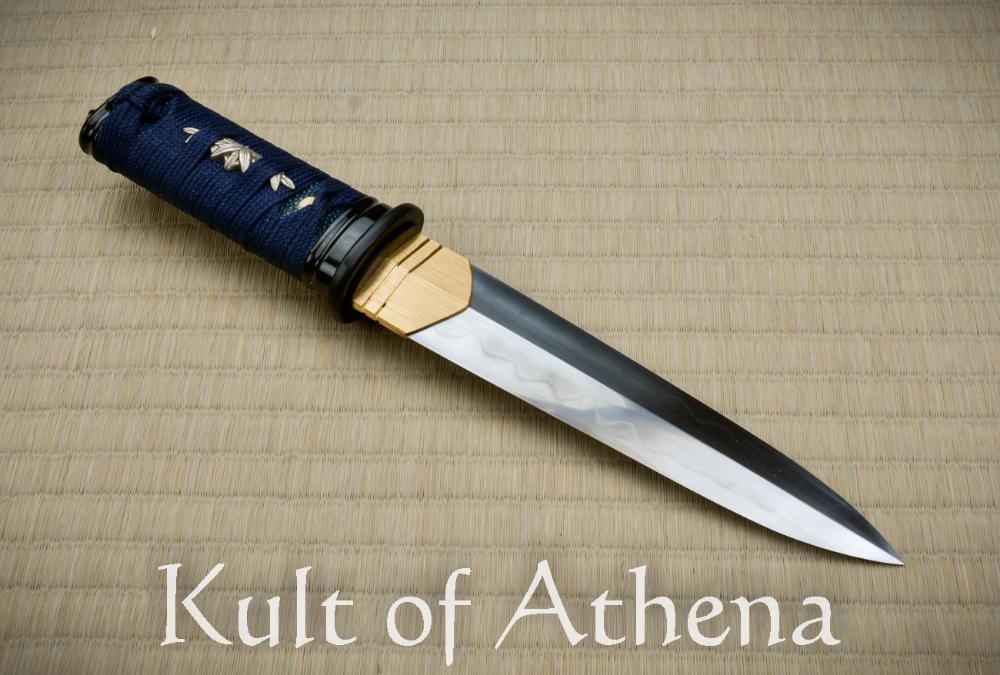 The blade is expertly forged from sharpened T10 high carbon steel which is polished to a fine mirror sheen to bring out the full beauty of its double-edged, flame-like clay tempered hamon line. Care has been taken to make sure all the various hand-finished koshirae components of the hilt fit well and seamlessly together. The wooden tsuka grip is fitted with blue rayskin which is tightly bound in tight tsuka-ito cord. The dagger is paired with a well-carved saya with a fine glossy black lacquer finish and a unique koiguchi shape.