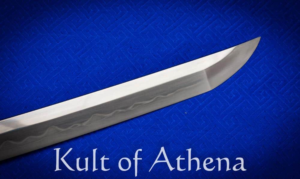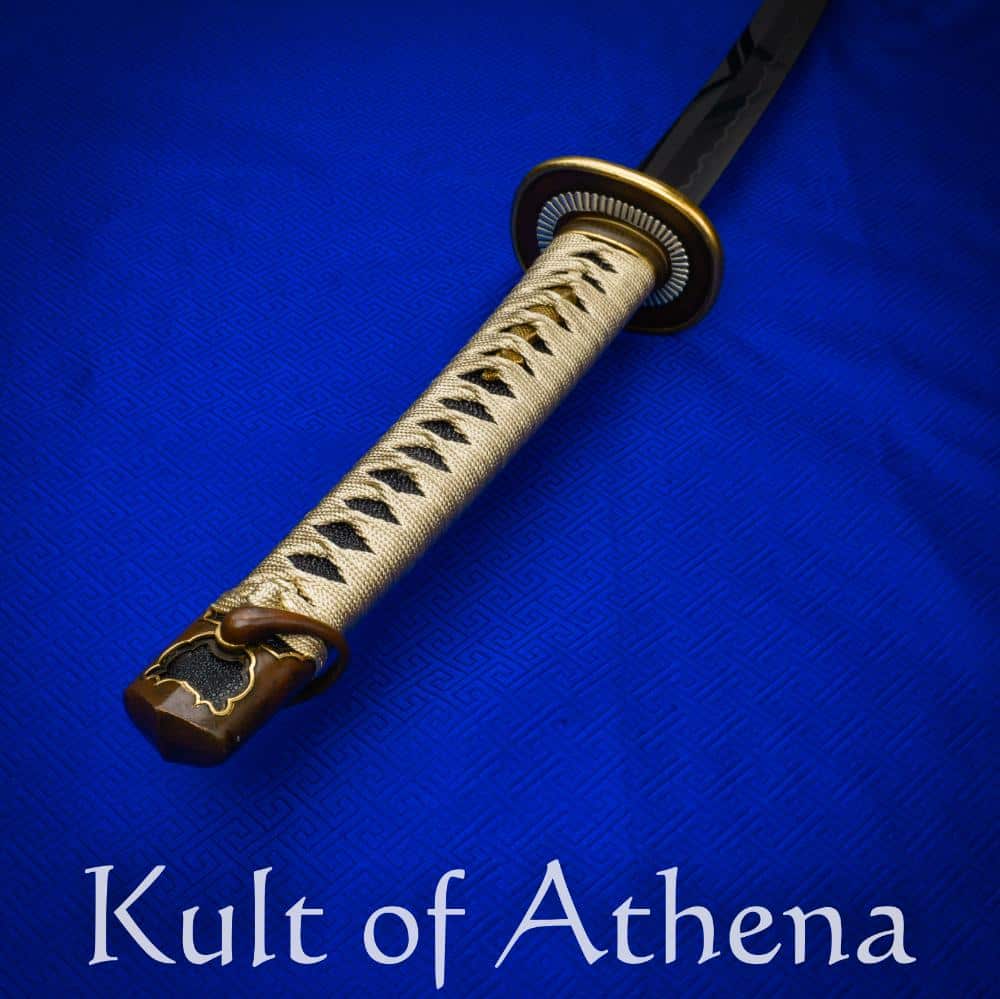 The tachi has a deeper degree of curvature and a slightly longer blade than a katana, which benefitted the feudal samurai fighting on horseback, as the curved blade adds significant downward force when cutting. The length of the nagasa varied throughout the periods, but was later officially fixed between 44 to 80 centimeters. An authentic tachi is heftier compared to a katana, but is generally lighter in proportion to its length, has a greater taper from hilt to point and a smaller point area for penetrating heavy clothing. Unlike a traditional katana, tachi is carried on the belt blade down for faster wielding and slashing. The carrying system on the saya consists of ashi (suspension loops), and obitori (cord) usually made of leather or silk. The obitori is used to attach the tachi to the obi (belt) and the tachio is wrapped around the waist to further stabilize the saya. The tsuka typically follows the curvature of the nagasa and is made of rayskin covered hardwood and is most often hinerimaki wrapped. Morozori tsuka was most commonly used in tachi swords, but here is no set shape of tsuka for a tachi, as it changed a lot troughout the different periods. Despite all the changes, the characteristic mountings on tsuka and saya, stayed in fashion. These mountings are called kabuto-gane (hilt cap), semegane (scabbard ring) and saya-jiri (scabbard tip).