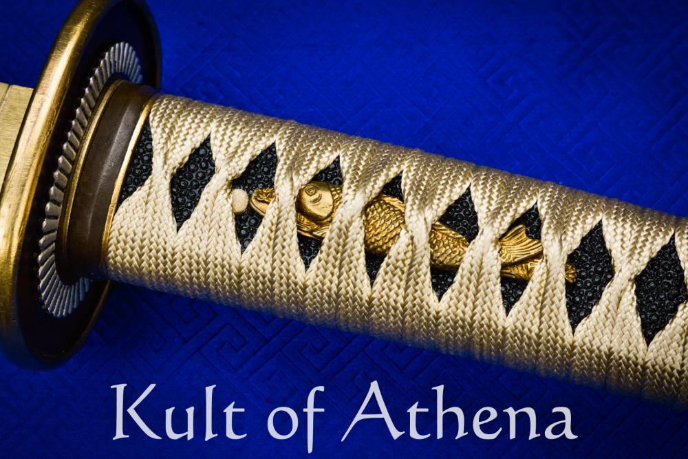 We took some inspiration from our Kogane series and implimented it in the materials. The hardwood tsuka is covered with black rayskin and wrapped in golden silk rope, using hinerimaki style to ensure maximum grip. The black and gold color scheme continues gracefully to the oval tsuba, embellished with a golden edge and a golden chrysanthemum-like flower pattern in the middle. The kabuto-gane, the sarute (ring hanging from kabuto-gane), fuchi and tsuba, are all made of antique finished copper. Brass seppa plates and habaki secure the gorgeous tsuba in it’s place. The tsuka is further decorated with two brass fish menuki traditional to tachi.