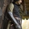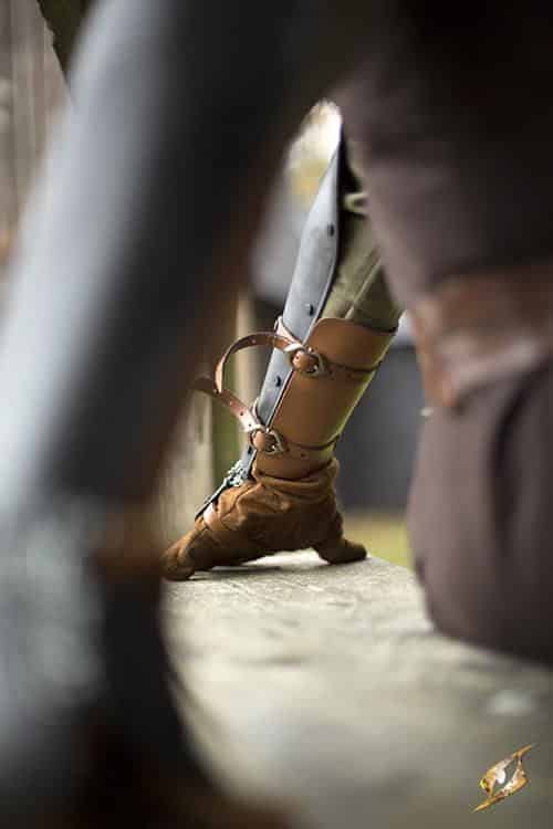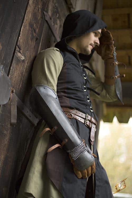 The armor is crafted from 20 gauge steel with an Epic Dark finish. This aged and darkened finish is not simply for looks, but it also gives some oxidation resistance to the armor to hinder rust. It still requires maintenance and oiling to ensure that it does not rust. The chainmail is of butted construction and the leather is thick vegetable tanned leather. The interior of the armor is blackened to give it some resistance to rust.
