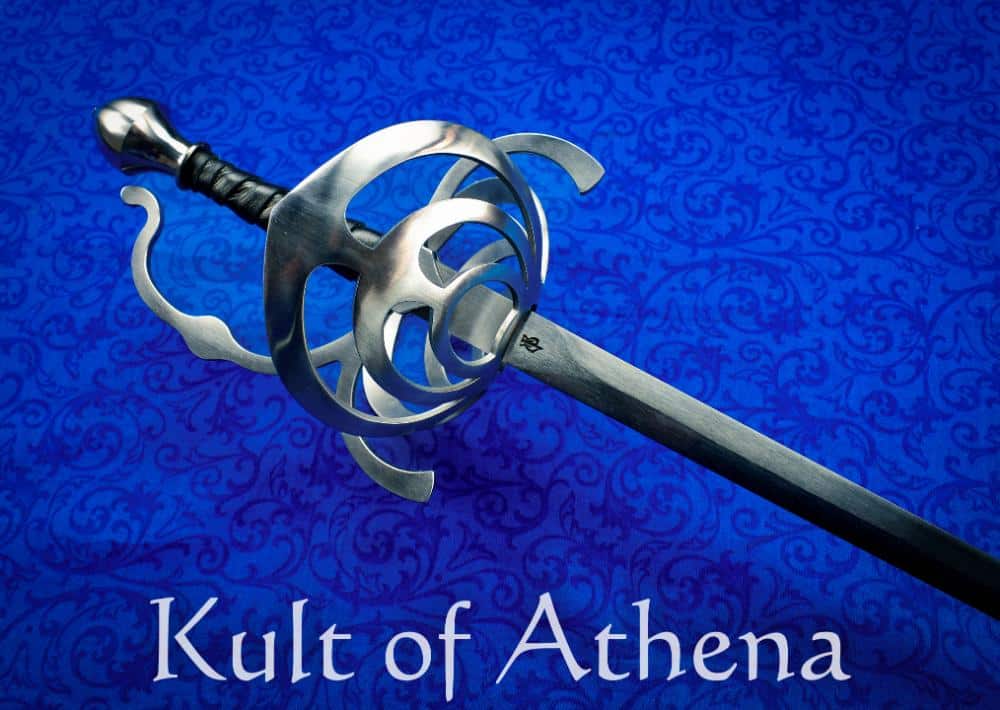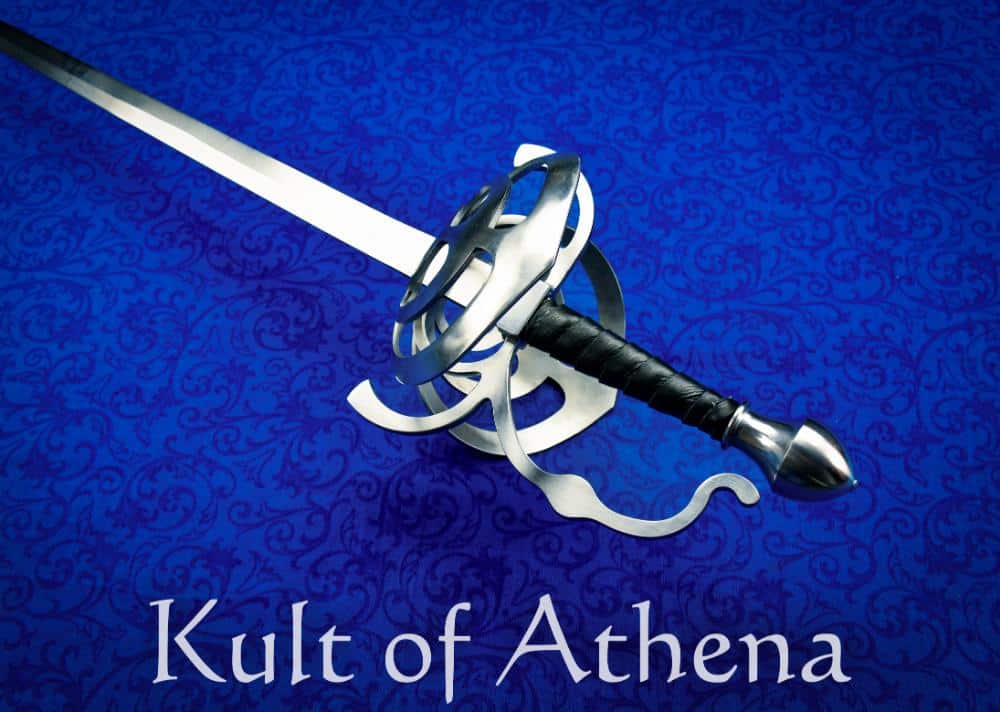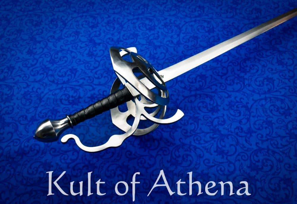 This well-crafted Duelist’s Rapier is made in the USA by Baltimore Knife and Sword and has a resilient blade of medium carbon alloy steel with a tempered hardness of 48-50 HRC which is ideally suited for holding up to repeated blade-on-blade contact in stage and sport fighting. The hilt is steel and the grip is overlaid in a tight binding of supple leather. The tang is peened over the pommel and reinforced by welding the guard and pommel directly to the thick tang for a very strong construction. Well-balanced and responsive, this rapier also has a swept guard with thicker bars to give the entire hilt reinforced protection for the hand.