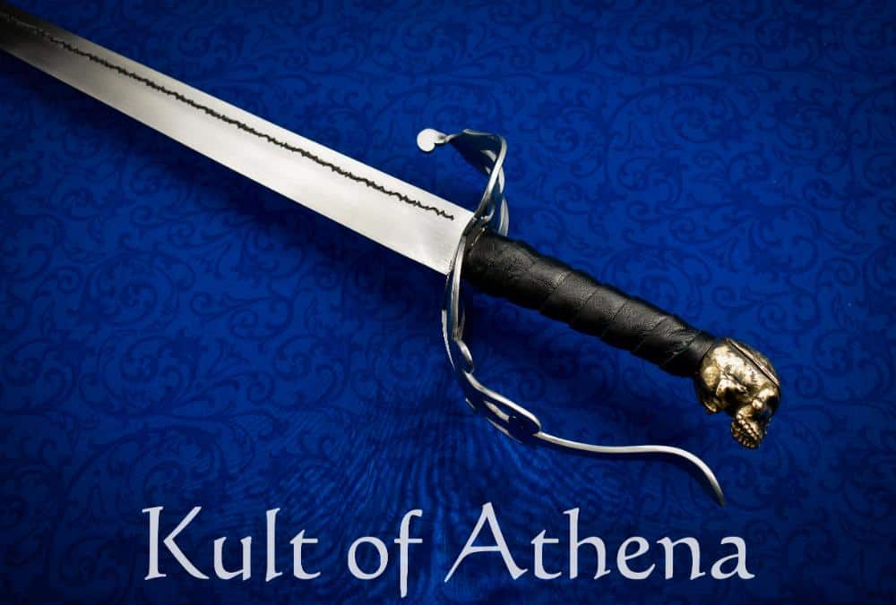 This custom-crafted Cutlass is an ideal flourish to complete the ensemble of a Pirate or Buccaneer! Its pommel is a cast skull complete with eyepatch and is crafted from solid antiqued brass. Though the piece is impressive enough to look upon, its fully functional and built to withstand repeated blade-on-blade contact from stage and sport combat. Its blade of medium carbon steel has a tempered hardness of 48-50 HRc.