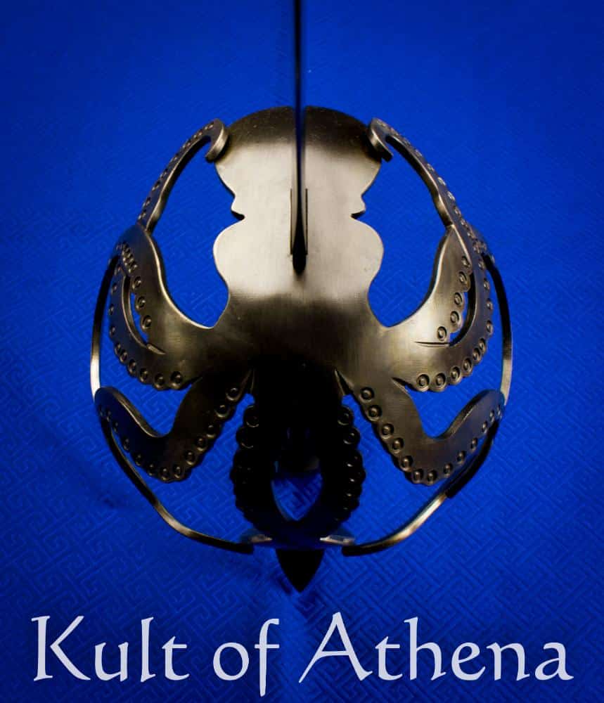 The gorgeously and meticulously handcrafted Kraken Cutlass by Baltimore Knife & Sword was purpose-designed for the rigorous blade-on-blade contact of stage and sport combat and doing it with style. The blade is a medium carbon alloy steel with a finished hardness of 48-50 HRC. The intricate Kraken guard and pommel are crafted from antiqued steel; the grip is bound in painstakingly laid braided blackened wire accented with metallic red wire for a truly eye-catching appearance. The cutlass is not only an impressive piece on appearance alone, but entirely ready for stage and theatre combat at well.