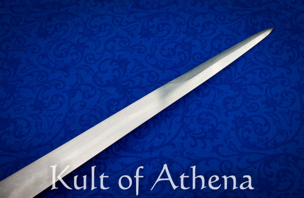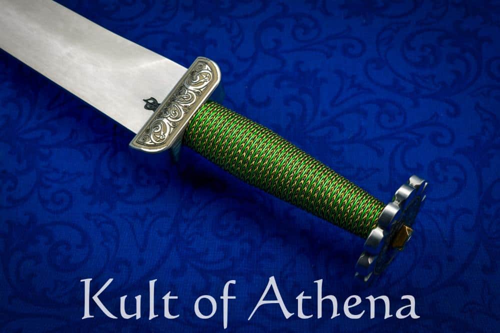 A unique and beautiful handcrafted piece that truly completes and dignifies an ensemble! This Medieval Dirk by Baltimore Knife & Sword has a blunt-edged blade of medium carbon alloy steel for stage, theatrical or reenactment combat with a finished hardness of 48-50 HRC. The blade is fitted into an antiqued steel hilt with lavish scrollwork etching and a meticulous wire wrap grip of braided brass wire and metallic, emerald green wire. The tang is secured over the pommel with a solid peen over a brass peen block. A unique and beautiful handcrafted piece that truly completes and dignifies an ensemble!