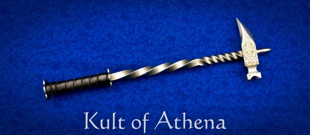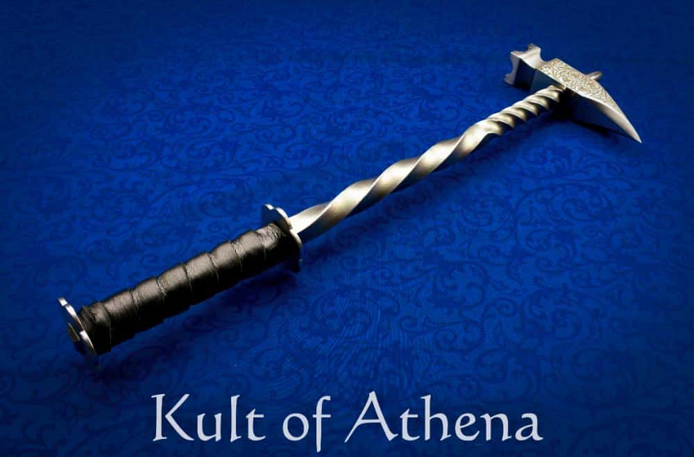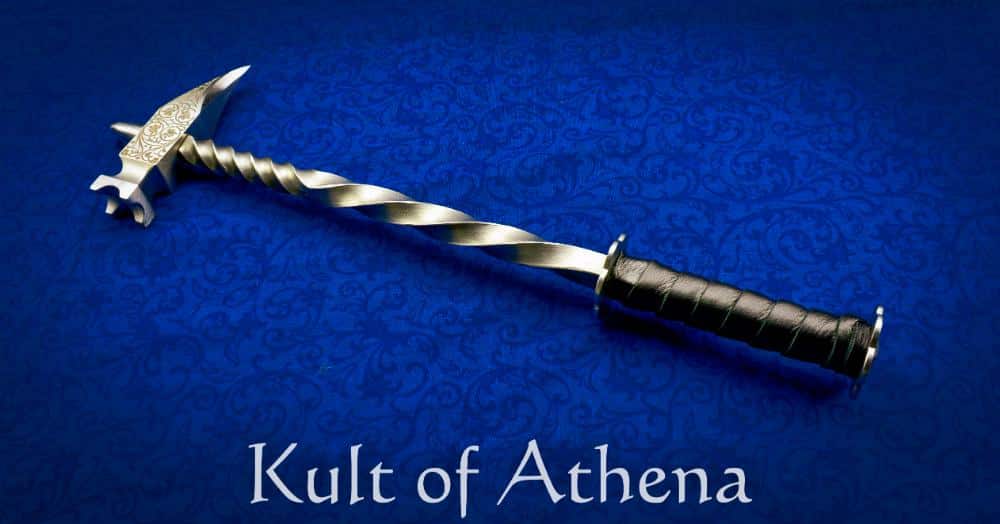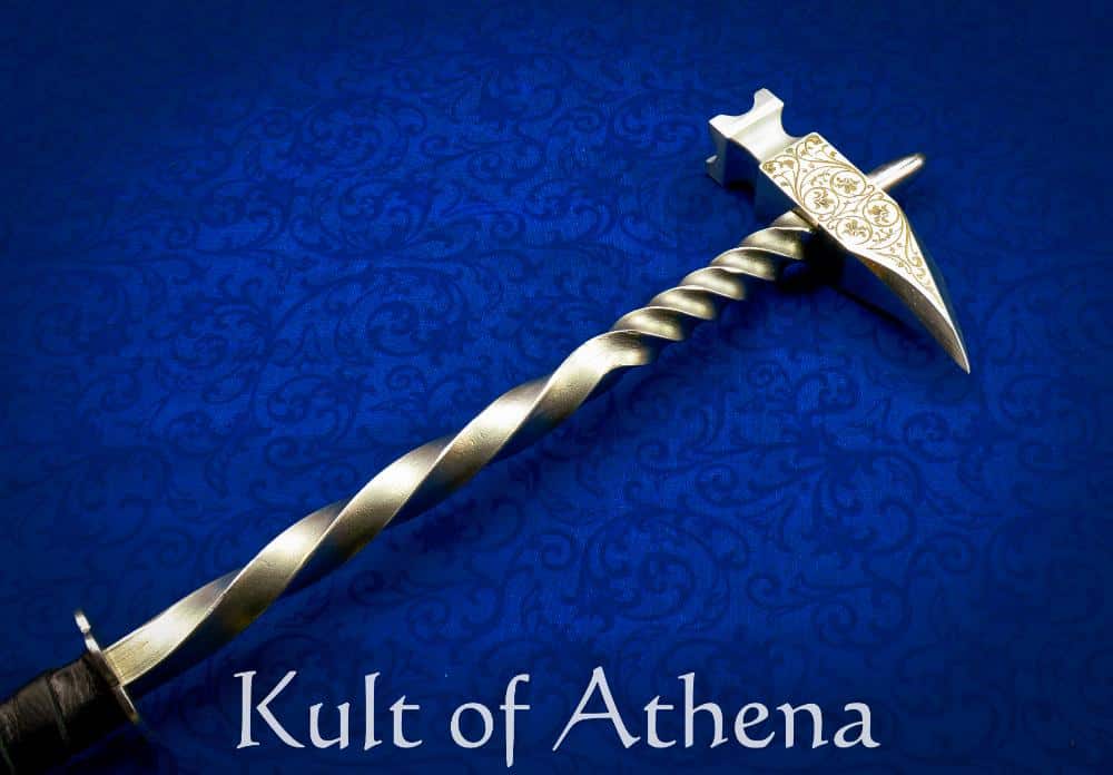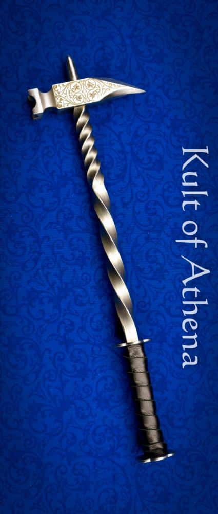 The warhammer’s body features a twisted steel haft that adds both rigidity and visual appeal. Its 5 ⅝” grip is wrapped in leather for a firm hold and is bordered by two steel rondels welded directly to the haft. This integrated construction provides exceptional structural strength and durability throughout the weapon.