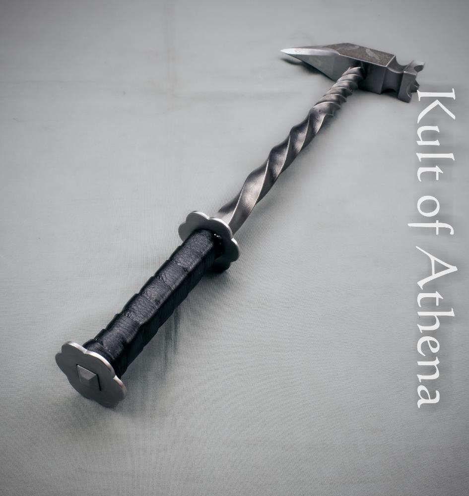 The body of the warhammer features a twisted steel haft that provides both rigidity and distinctive visual character. Its 5 5/8” grip is wrapped in bound leather for a secure hold and is bordered by a pair of steel rondels welded directly to the haft. This solid construction ensures strength and reliability throughout the entire weapon.
