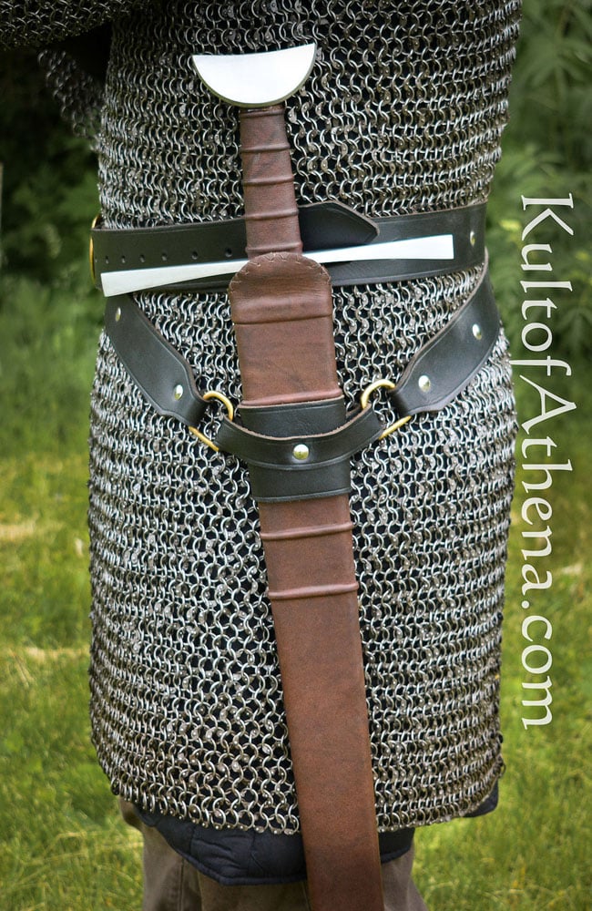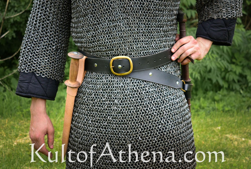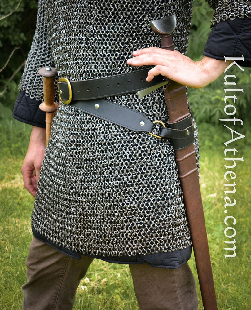 This double wrap belt is made from thick and sturdy black leather. Meant to be wrapped twice about the body, it has an integrated leather holder for a sword scabbard. It could also be used to fit many axes or maces as well. The buckle is brass, while the rivets are nickel.