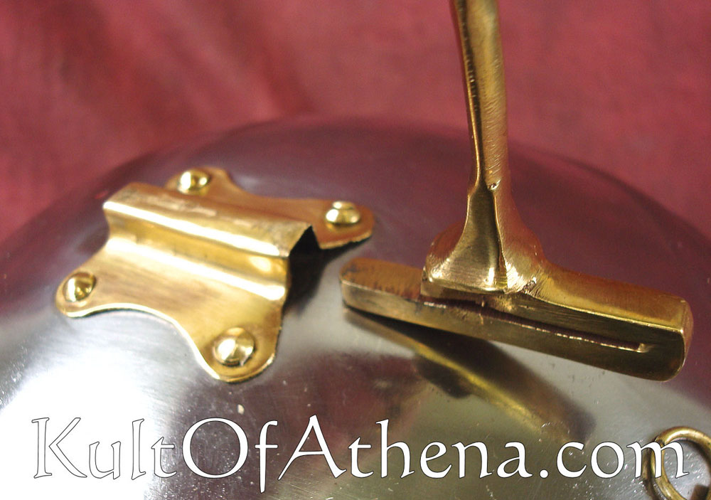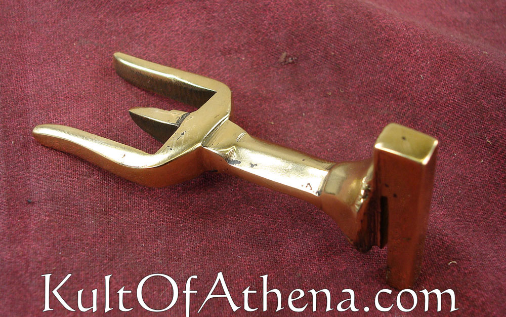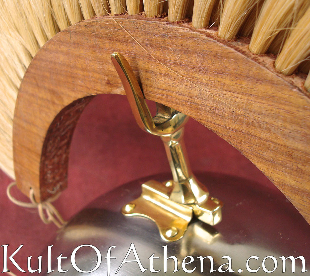 This plume holder is used to secure a crest to a Roman helmet. The brass holder slides into its slot, the crest is put atop the fork-like prong and the plume has its ends tied to the helmet to securely affix it into place. Originally intended for Deepeeka Helmet 6053N, this plume holder may fit other similarly crafted helmet slots. This plume holder is for a front-to-back crest alignment. Works with wooden or metal crest boxes. Can be made to fit Roman Crests 1716618100 or 1716618200. Will not fit Daniyal Steelcrafts crests.