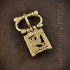 This Medieval buckle of brass is fashioned in the form of a wolf. It has two pegs on the reverse that can be used to rivet the buckle to a leather belt strap.