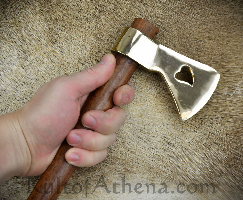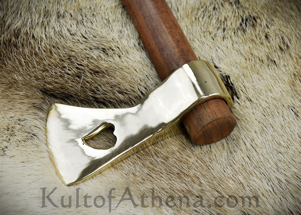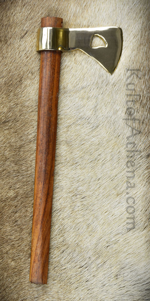 This small Tomahawk has a head crafted from brass; it is mounted upon a haft of wood.