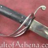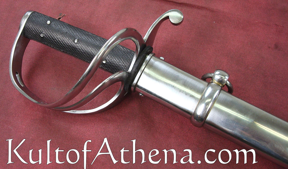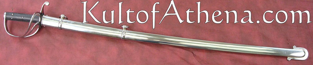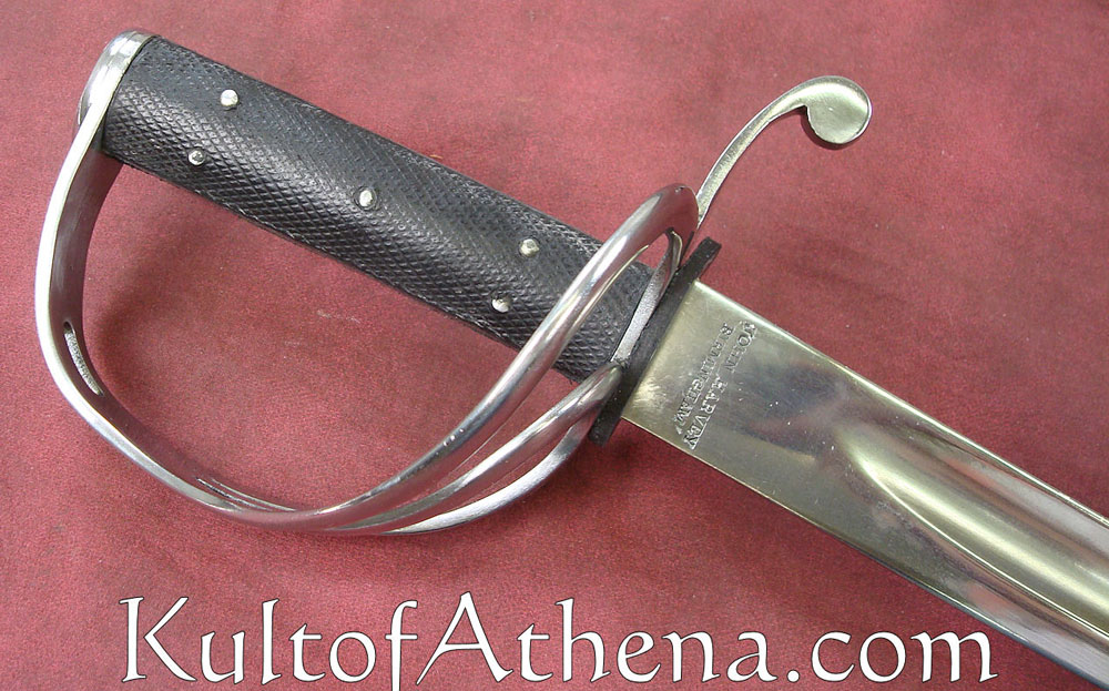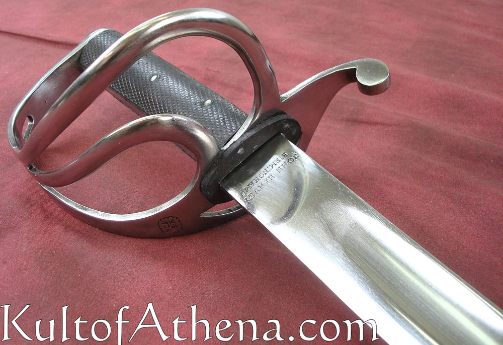 This replica of the 1853 Cavalry Saber has an unsharpened blade of high carbon steel. The guard is of steel and the grip is formed of two checkered, hard-rubber halves riveted to the thick tang. The base of the blade is inscribed with the replicated makers mark John Harvey of Birmingham. Comes with a steel scabbard with two integrated hanging rings of steel.