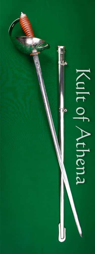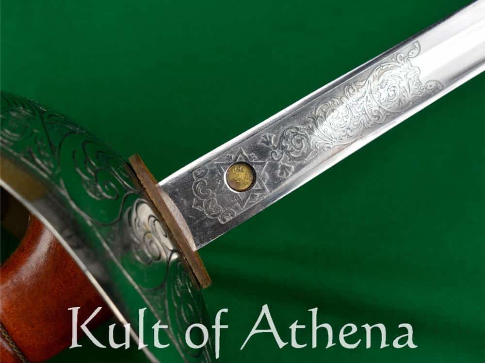 The large, bowl-like guard gives excellent protection to the hand without making the sword heavy and the ergonomic, pistol-like grip has a groove for the thumb on the top of the grip to maximize point and direction control of the blade. The weighted pommel helps to balance the blade, keeping it quick and maneuverable.