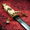 This British Naval Officers Dirk has a tempered blade of EN9 high carbon steel. The 5-Ball beaded crossguard and pommel are of brass and the grip is faux ivory with a inlaid cigar band of brass with an engraved anchor and the cypher of the British Crown. It comes with a black leather scabbard with brass fittings and hanging rings.