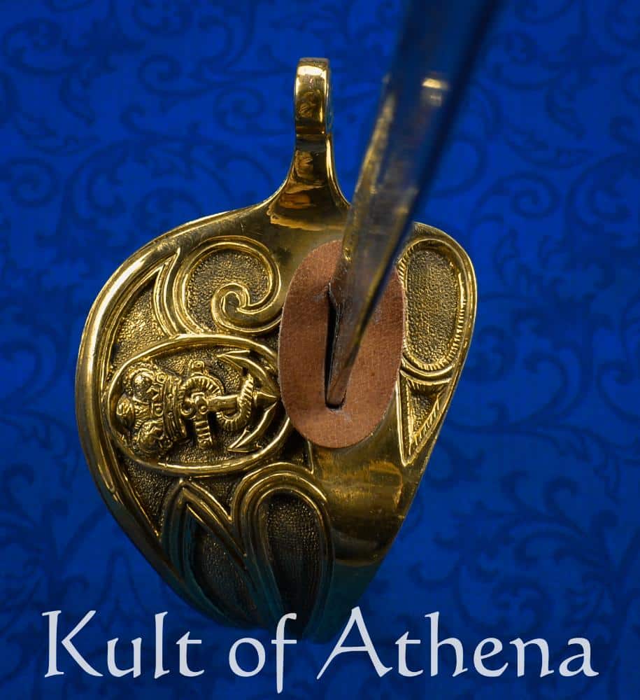 This reproduction of the Royal Navy Officer Sword with the Pipe-Back blade design has an unsharpened, tempered blade of high carbon steel. The blade is heavily etched with the symbols of the Navy and bears the markings of Prosser, a sword manufacturer in Charing Cross London. The brass hilt has the iconic fouled anchor design coupled with the lion pommel – Admiral Nelson himself had such a lion pommel on his own sword. The grip is faux textured rayskin and is inlaid with brass wire. The scabbard is of black leather overlaid with brass accents, throat and chape and two suspension rings. A leather washer is fitted to the base of the blade to protect the crossguard from the brass scabbard throat