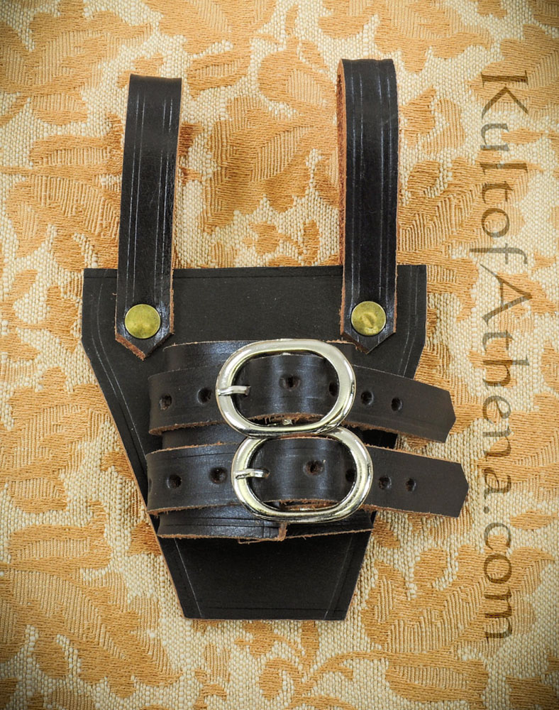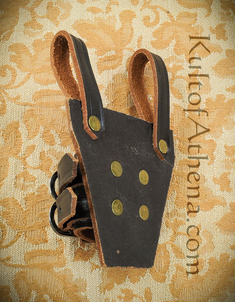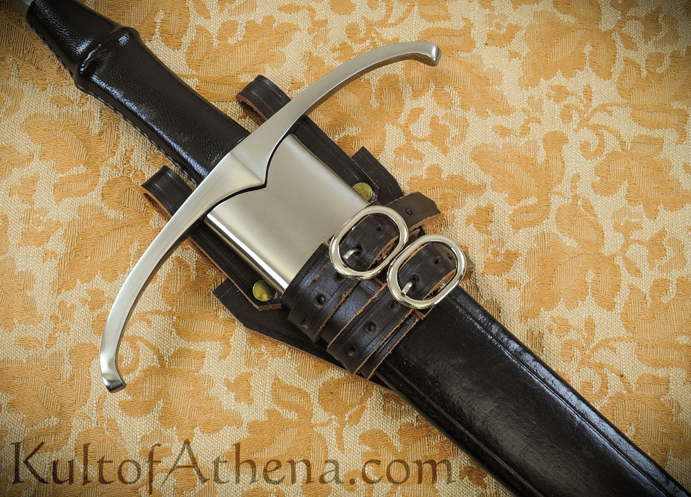 This brown leather sword frog has two steel buckles with adjustable straps. It is held together with brass rivets and has two integrated belt loops. It will fit scabbards for most swords, though it cannot be drawn tight enough to hold the scabbards of thin rapiers, smallswords and thin sabers. The scabbard should be at least approximately 2 wide at its throat to snugly fit in this frog. The buckles allow the frog to hold a scabbard with a maximum width of approximately 3 1/8.