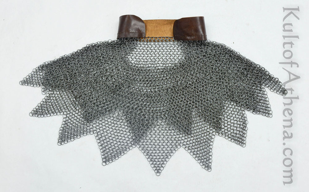 This aventail with dagged edges is crafted from butted round rings. The aventail is stitched onto a thick leather band which can be riveted into your own helmet to upgrade it with an additional aventail. The rings are 9 mm in diameter and 16 gauge in thickness.