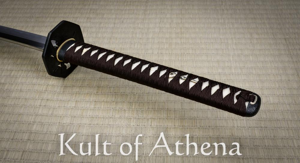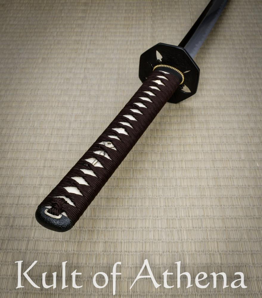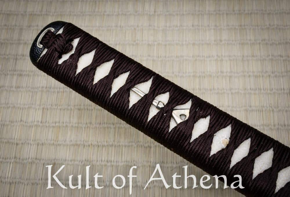 Two words best describe this katana: hidden strength. The katana’s power is hidden beneath the quiet elegance of its design—its blackened, textured handle furniture, and the refined silver menuki. The premium dark brown Japanese cotton ito wraps around authentic samegawa (ray skin) in a traditional diamond pattern, offering both aesthetic beauty and functional grip. The dark chocolate brown saya, paired with a contrasting light brown sageo, buffalo horn kurikata, and kojiri, completes the visual theme of strength and simplicity.