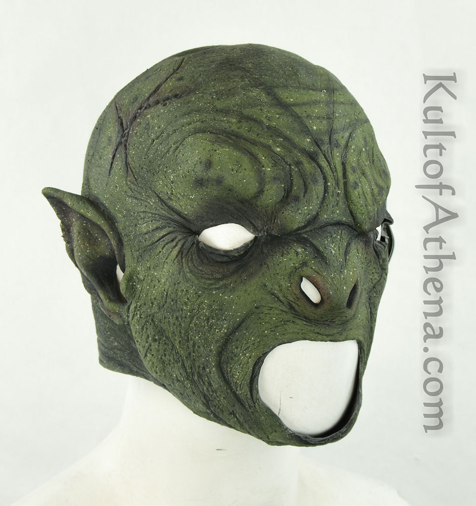 Epic Effects Green Carnal Orc is a full Orc Mask with a ferocious face, perfect for a true orc warrior. This mask has an orcs distinct features, including: a low, furred brow, serrated pointy ears and a flat nose with large nostrils. The skin is leathery and hand painted dark green, its creases and furrows shaded to give the impression of recent battles. With such attention to detail, this mask achieves an aggressive appearance while also maintaining realism.