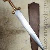 This Celtic Dagger is nearly a short sword in length; it has a blade forged from high carbon steel and a hilt of cast bronze. The blade tang is dual-riveted into the hilt with brass rivets. The robust scabbard is crafted from thickly-stitched leather.