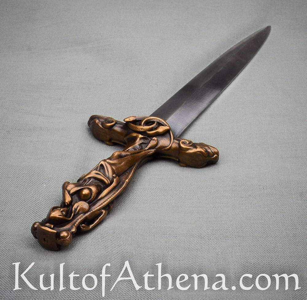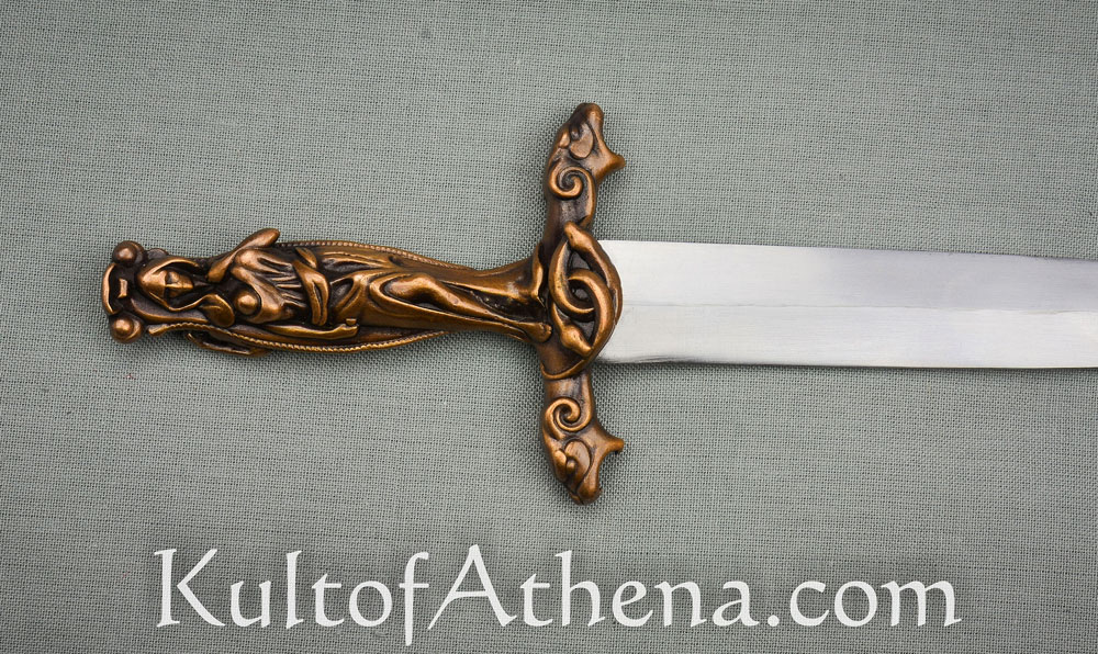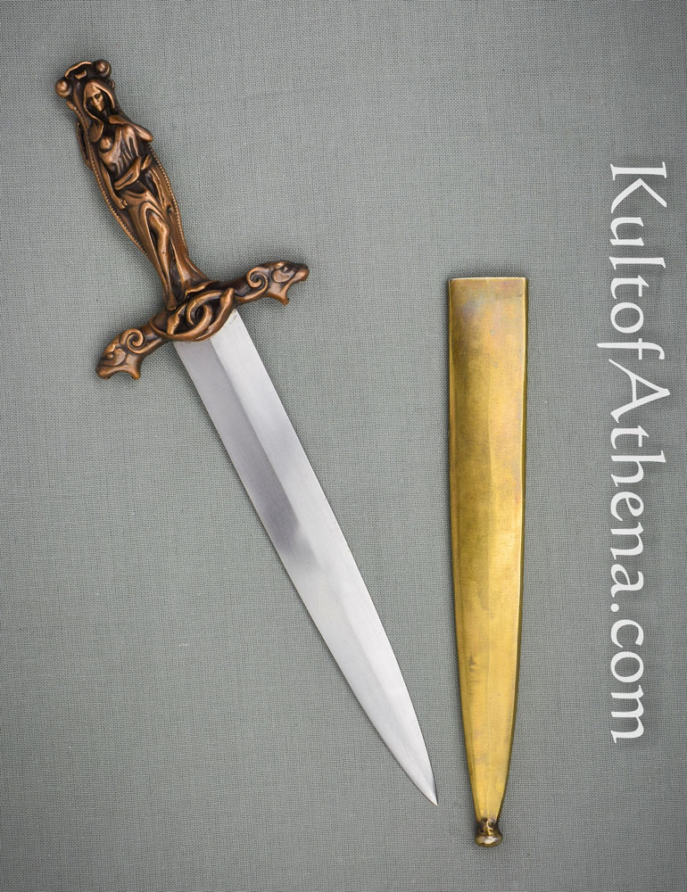 Duality is enshrined upon this arcane dagger which bears a pair of Goddesses upon its hilt; they stand back to back and on one side the Goddess has a clamshell and swan wings at her feet whilst her opposite looms above entwined serpents. The handcrafted blade is forged from high carbon steel and the hilt is finely cast antiqued brass. Included is a steel scabbard with an antiqued bronze finish.