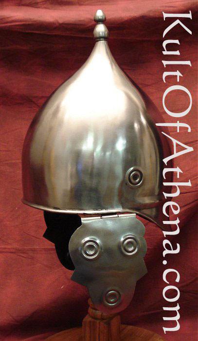 This Celtic or Gallic helmet is made of carbon steel and features hinged cheek pieces. Includes a padded arming cap.