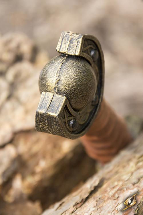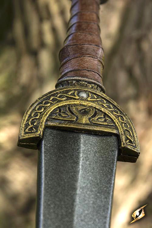 Epic Armourys Celtic Leaf Sword is a latex-hybrid medium sword inspired by the Celtic tribes of early history. The sword is 85 cm long from tip to pommel, with a double-edged blade designed for chopping thanks to its leaf-like shape. The detailed crossguard and crescent pommel features gold accents and protects a sculpted grip. The handle is cast and painted to look like leather and is ergonomically shaped, allowing for comfort and an impressive appearance without requiring leather maintenance.