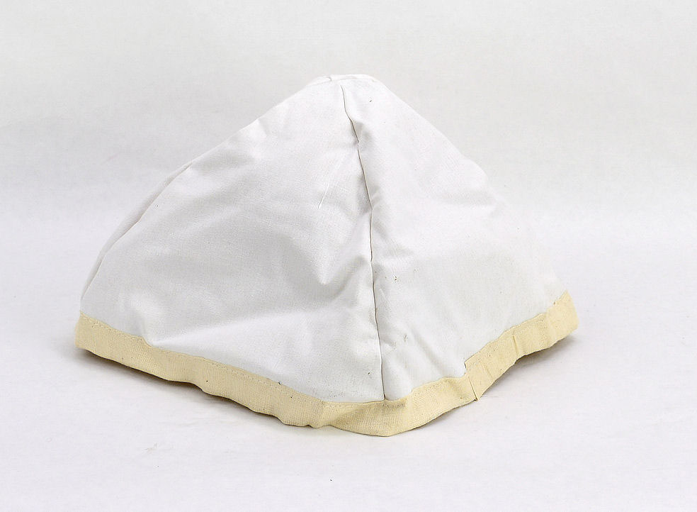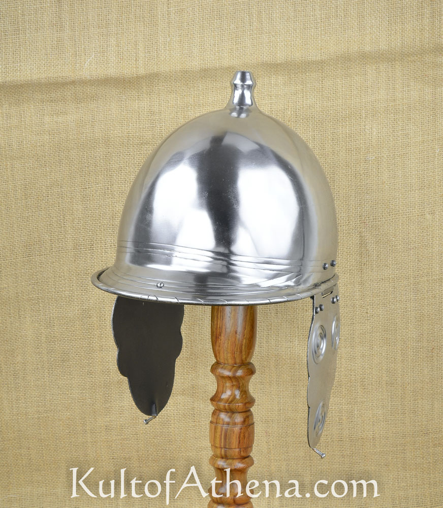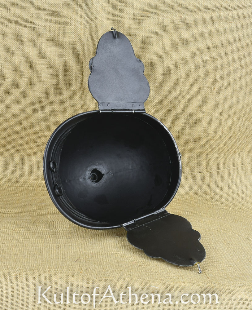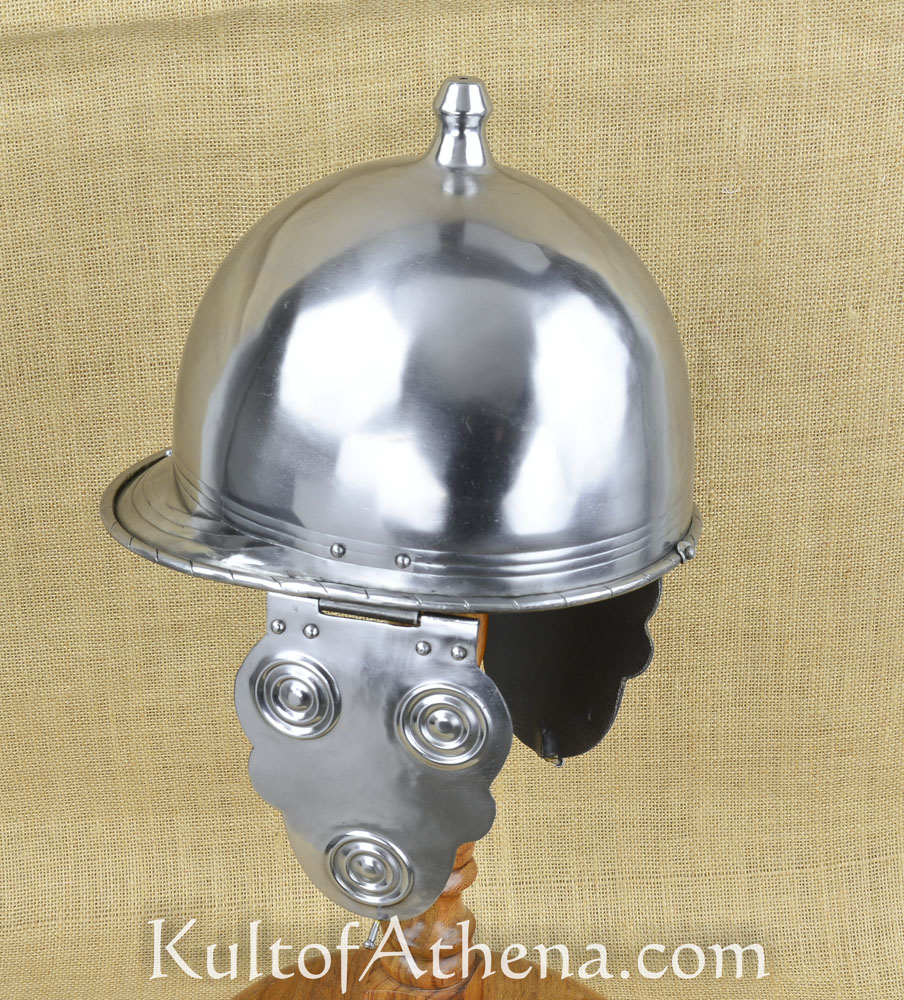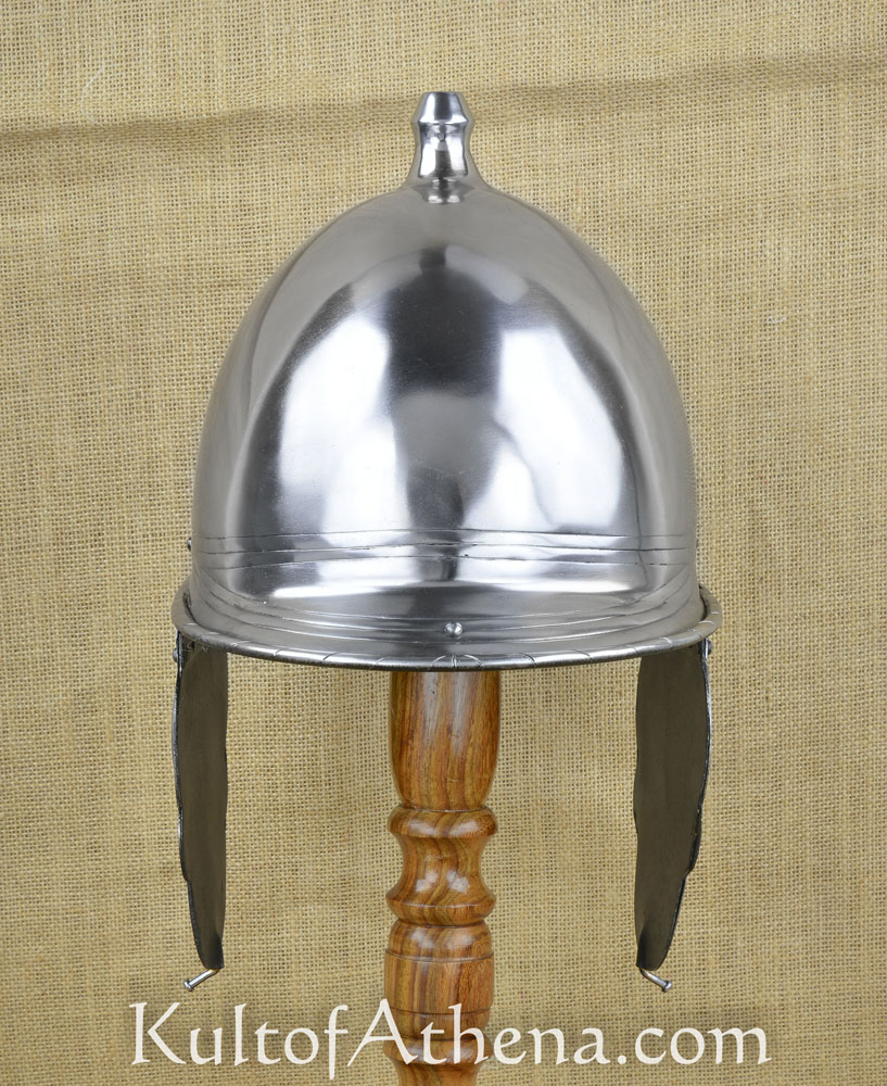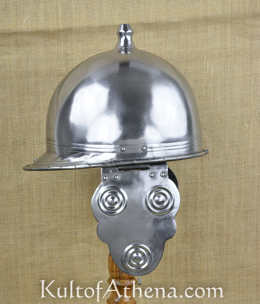 This reproduction of a Celtic Montefortino style helm is constructed from 18 gauge steel; the cheekplates with embossed design are hinged and the interior of the helmet is blackened and unlined. Paired with the helmet is a separate padded cotton arming cap which can be worn beneath the helmet for greater comfort and cushioning.