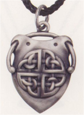 The Celtic Shield Pendant is made of cast metal in a pewter finish. Includes adjustable neck cord.