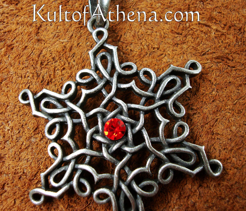 This Celtic Star, formed of elaborately entwined knotwork, is crafted from antique-finished pewter. A red crystal is set into its center. It comes with a matching chain that can be closed with a clasp. The metal is lead and nickel free.