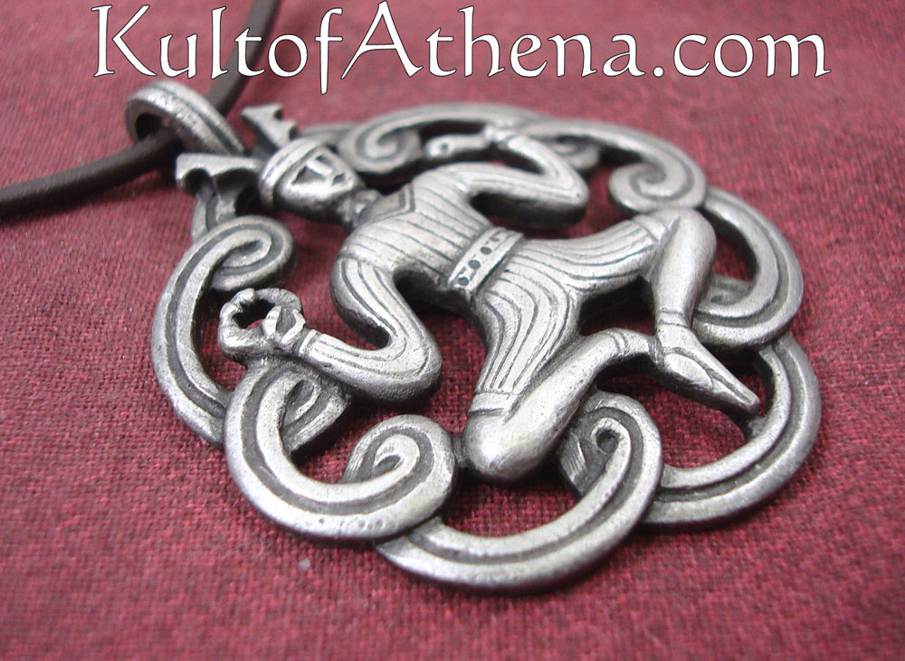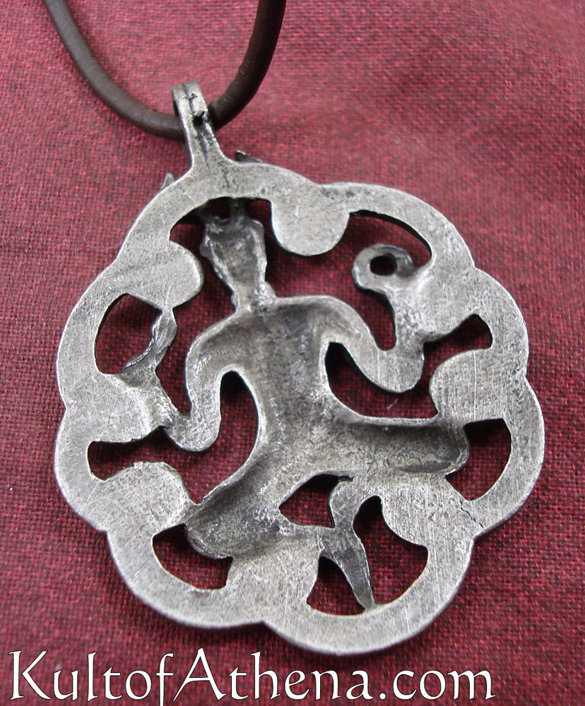 This amulet of the mysterious and prolific Celtic god Cernunnos is made of tin alloy overlaid with antimony and patinated for an antiquated appearance. Comes with a leather neck thong.