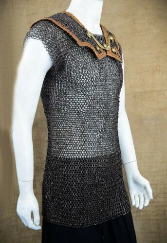This Roman Lorica Hamata is constructed from alternating flat and round rings of mild steel. The round rings are dome riveted and they alternate with solid flat rings. The individual rings are 9 mm in diameter and 18 gauge in thickness – they have been given a darkened, blackened finish. The shoulder panel doublets are framed in stitched leather and the Hamata is finished with a brass chest closure hook.