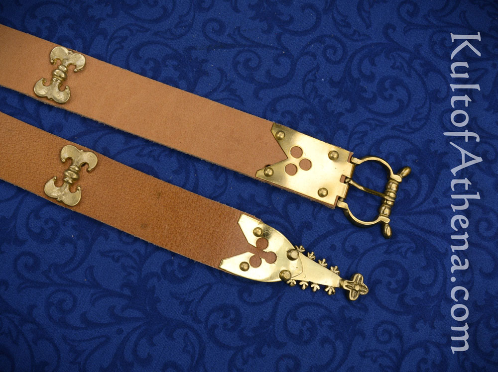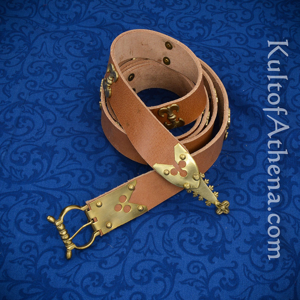 This Chivalric Medieval belt has a buckle and chape which are crafted from solid brass and riveted to a thick leather belt of light brown leather. Brass decorative studs are sturdily riveted to the belt for a complete and embellished finish.