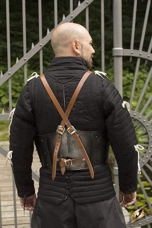 It is fully usable with Epic Armourys other metal work products, giving you the freedom to customize your characters costume. Made of 1 mm thick mild steel and top-grain leather straps and fittings, this armour piece is built to withstand the abuse of a LARP or reenactment with regular leather and metal armour care.