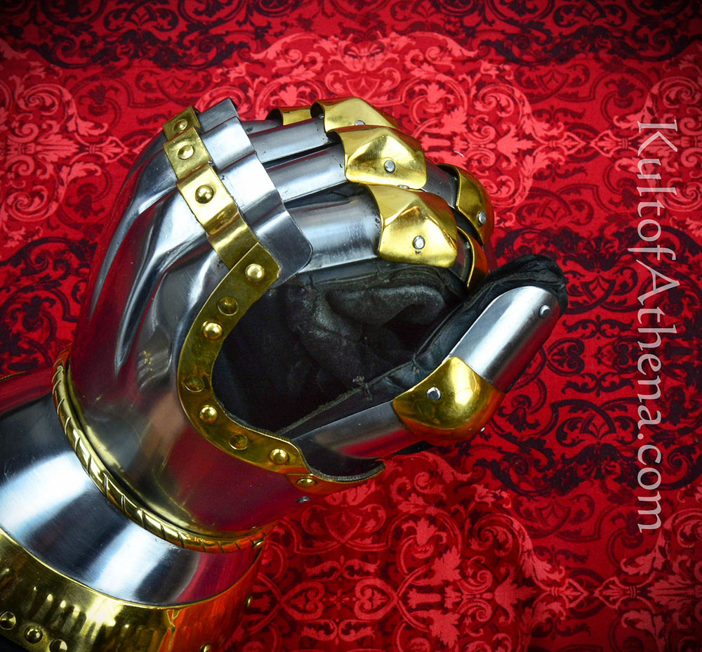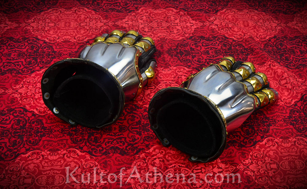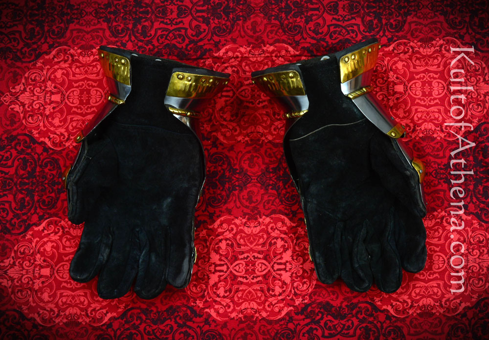 This set of wearable and articulated Churburg gauntlets are crafted from 16 gauge steel and embellished with brass trim and brass knuckles. The gauntlets are fitted with an integrated suede leather glove that is stitched to thick leathers pads to protect it from chafe – these pads are in turn pinned and riveted to the interior of the glove. These gauntlets are sized for a Large sized hand.