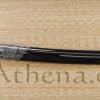 The saya scabbard is hand carved and given a gloss black lacquer finish. The mouth of the saya has an inlaid wrap of rayskin that was polished until it was smooth and then made flush with the rest of the scabbard by filling its recesses with black lacquer. The koiguchi is of buffalo horn and is carved to precisely fit the scabbard. An untied black sageo cord is included.