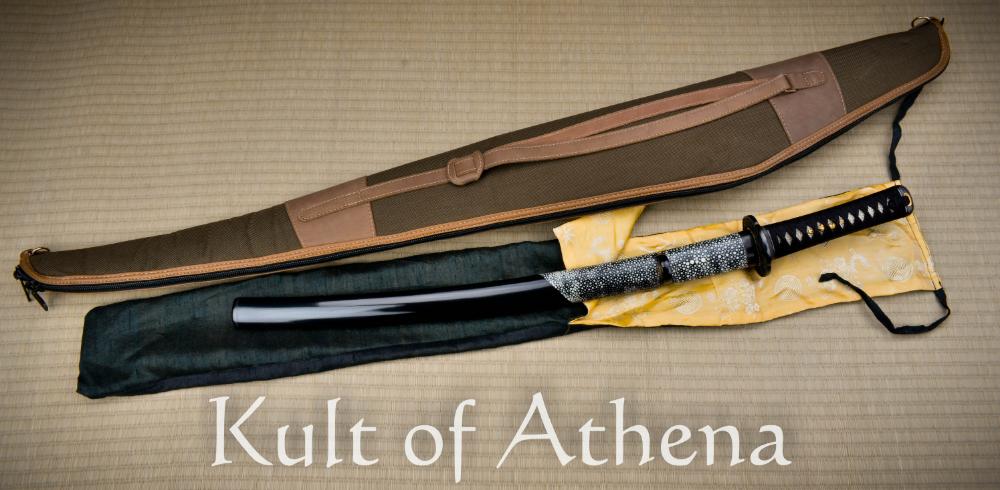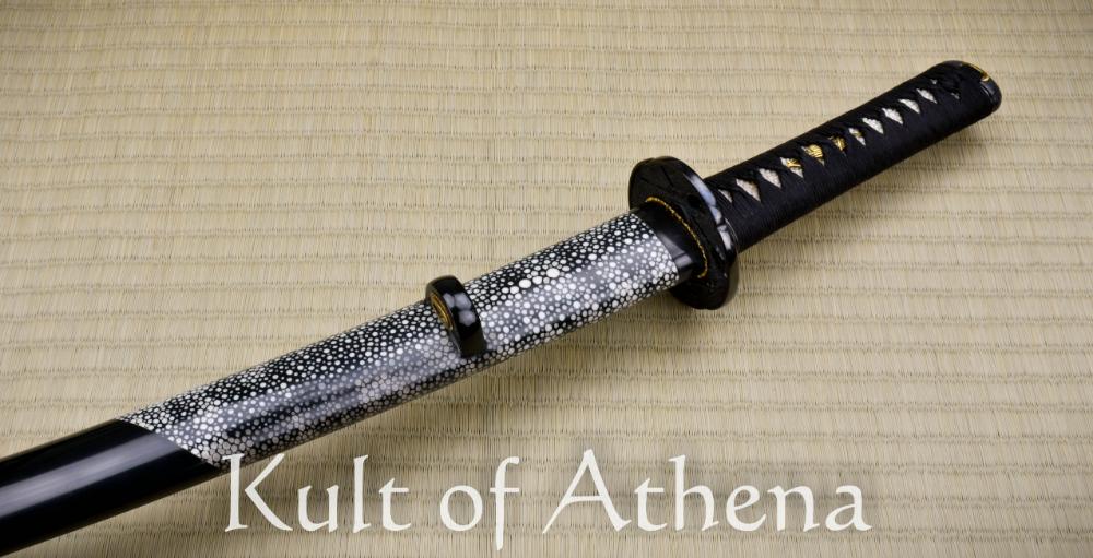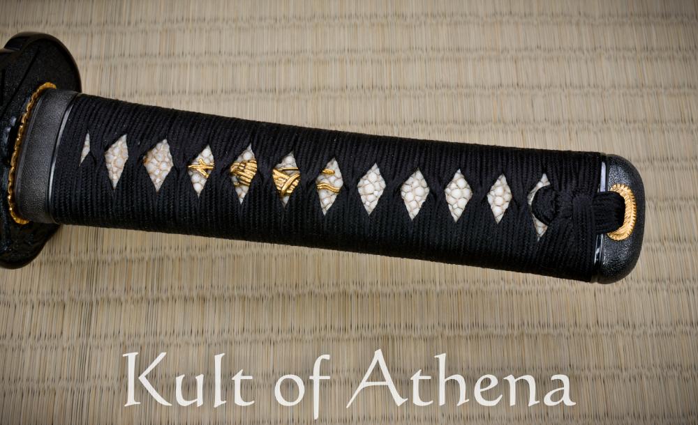 The “tsuka” or handle and “saya” or scabbard are hand carved to fit each individual blade ensuring a proper fit. The handle is wrapped in genuine imported silk from Japan and tightly wrapped around the full same-gawa or ray skin wrap around the wooden core. The saya is lacquered in black to a nice semi-gloss finish with a ray skin wrap near the mouth of the saya to strengthen this area.