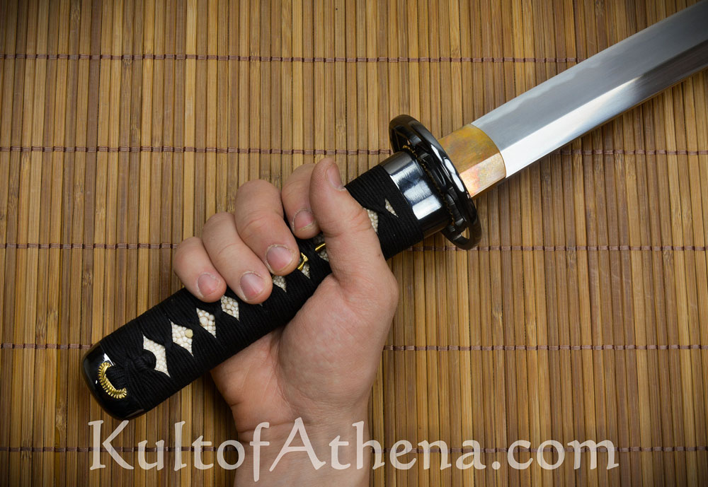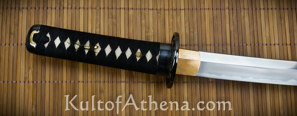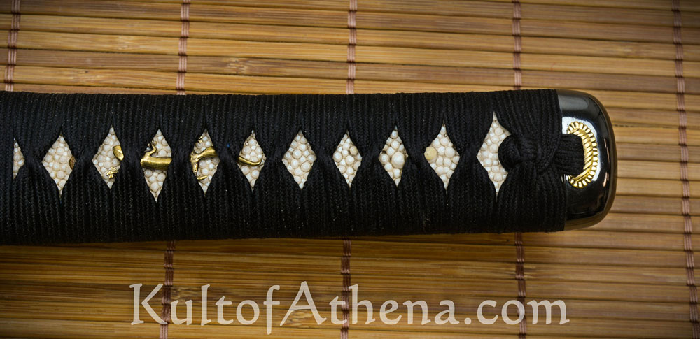 The wooden tsuka grip has a full-wrap samegawa rayskin which binds and strengthens the wooden grip – a benefit that is largely lost when one only uses strips of leftover rayskin to fit into the visible section of a grip. The rayskin prominently features a raised emperor node and this is the mark of a high quality rayskin wrap as there is only one such node on a skin. The tsuka was wrapped with imported Japanese silk ito and is tightly knotted and has the proper hishigami folded paper inserts beneath the folds to ensure a proper, traditional shape. Like many traditional Japanese swords, it has a single peg and does not require two because the tsuka was well-channeled to fit the nakago tang with a friction fit. An additional, spare tapered bamboo peg is included.