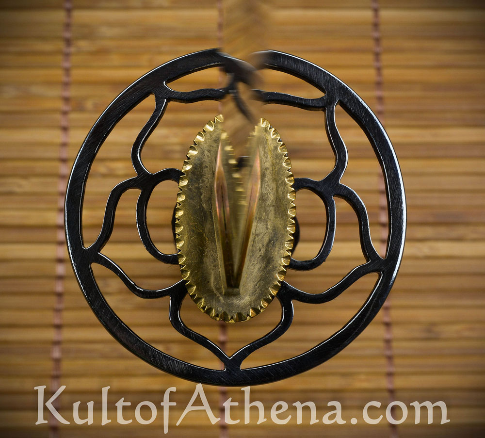 The Lotus Wakizashi is a premium production Wakizashi with a limited edition run of 20 swords. It has a blade forged from DNH7 high carbon steel which has been differentially tempered to create a hardened edge with a visible hamon and a softer, shock-absorbing body and spine. DNH7 has performance properties similar to 1075 high carbon steel and when well-tempered creates a durable blade that will hold a keen edge. A cross section of the blade shows more complex geometry than seen on more common katana: The thickest part of the blade is along the shinogi blade ridge and not at the base of the mune spine. This more complex design consideration allows for the spine to be tapered, thus lessening the overall weight of the blade and giving it a cross-section similar to lopsided diamond instead of a wedge.