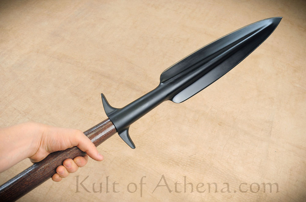 This modern boar spear has a large, wide head to cause a maximum sized wound on an unarmored target in short order. The spearhead is thin and sharp – allowing it penetrate deeply and more easily then a thicker spearhead with more mass. Its medium carbon steel aids in giving the thin blade some flex to resist snapping. The base of the spearhead has two winged lugs to prevent over-penetration, allowing the spearman to keep a target at a distance after the strike. The wide and dense hardwood shaft aids in directing a great amount of force into the target and to resist breaking.