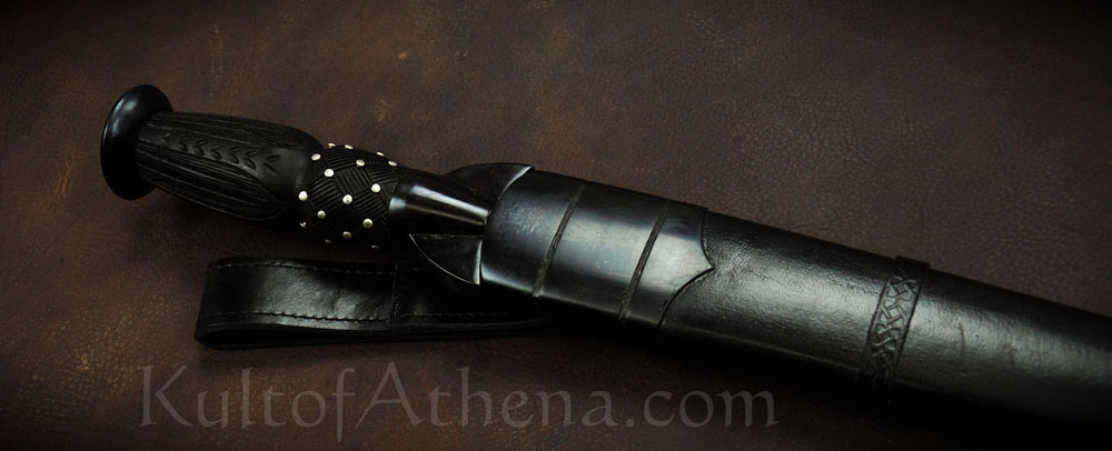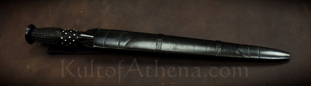 The Cold Steel Scottish Dirk features a 1050 high carbon steel blade forged to a hard spring temper, fully sharpened and battle-ready. The attractive Rosewood handle is capped with a contrasting blued-steel guard, bolster and disc-shaped pommel, and a handsome leather scabbard completes the package. The scabbard features an extra wide belt loop with a blued-steel throat and chape.