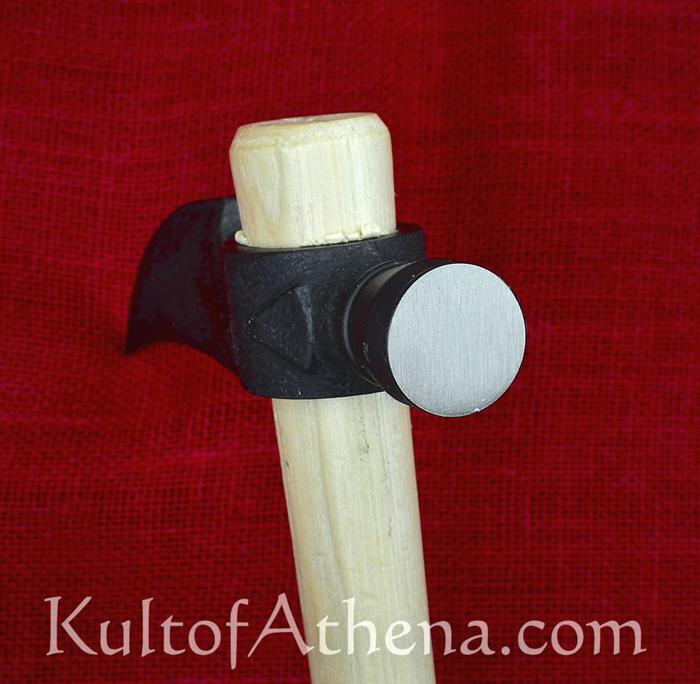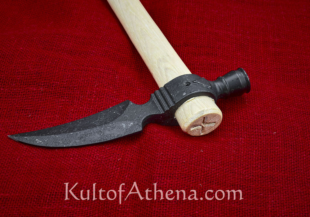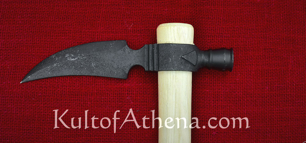 This Spontoon Hawk with its curved and pick-like axehead blade is a purpose-designed tool of war and self defense with little allowance for camp and utility use. The forward sloping dagger-like head will deeply puncture a target in a swift strike; the faux pipe bowl of solid steel on its reverse functions as a solid hammer for concussive blows.