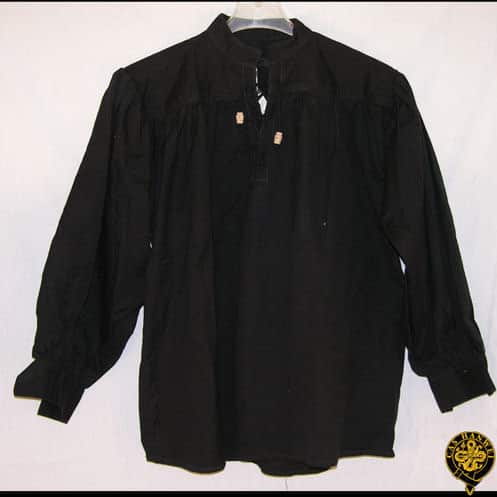 Suitable for use with many period outfits, this authentically-tailored shirt features a collarless laced neck with toggles, buttoned cuffs and billowed sleeves. 100% pure cotton.