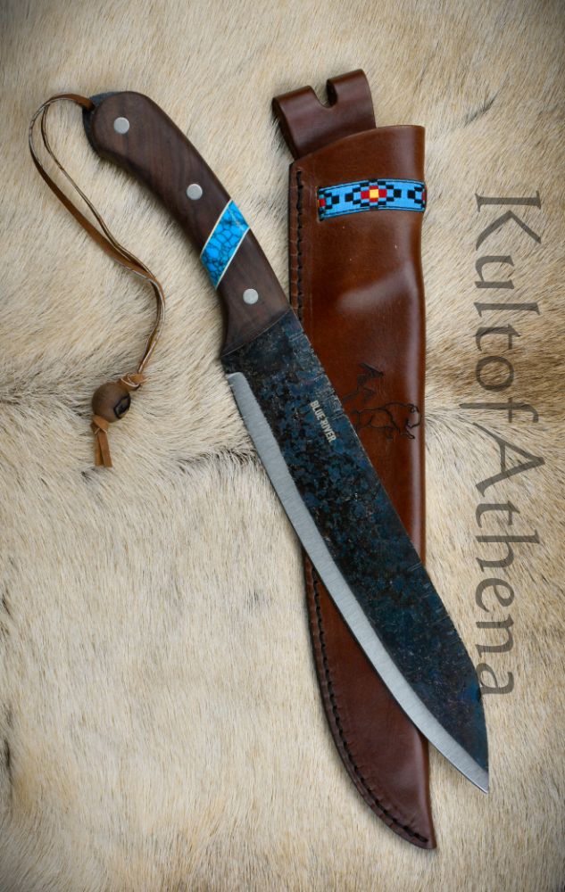 The blade is crafted from tempered and tough 1075 high carbon steel. Riveted directly to the thick tang for a robust construction are grip scales of finely polished walnut inset with beautiful bands of reconstituted Turquoise stone. The machete is paired with a sheath of fine handcrafted welted leather with a swivel-mounted belt loop for ready wear.
