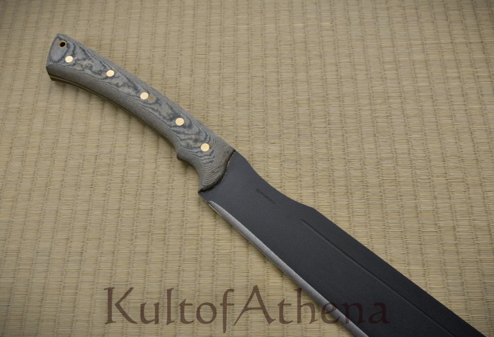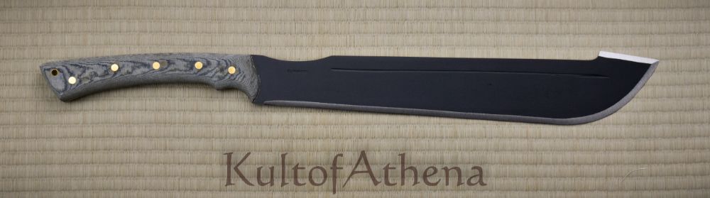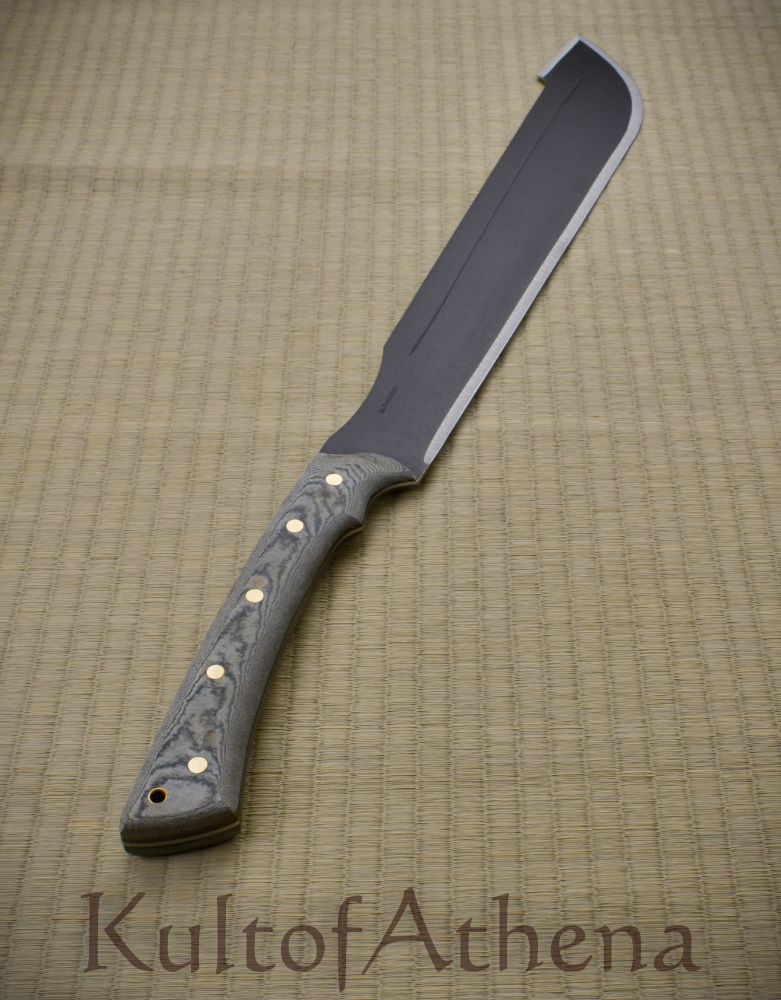 A trusty and tough companion to weather times of trouble, the Discord Machete has a wide blade well suited for powerful chops and hacks and this is paired with an elongated grip that allows for the machete to be used in one or two hands as needed. The blade is tempered 1075 high carbon steel with a practical epoxy black powder coated finish. The blade is finished with two halves of hard-wearing composite micarta which are solidly brass riveted directly to the tang for the most durable and lasting construction possible. This practical machete is matched with a tough sheath of faux leather with buttoned retaining straps and a swivel-mounted belt loop for ready wear.