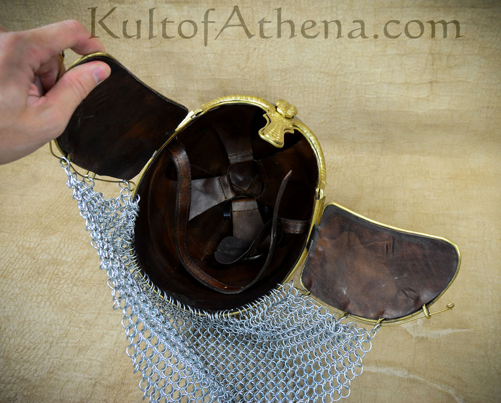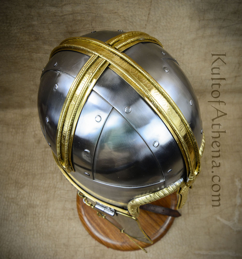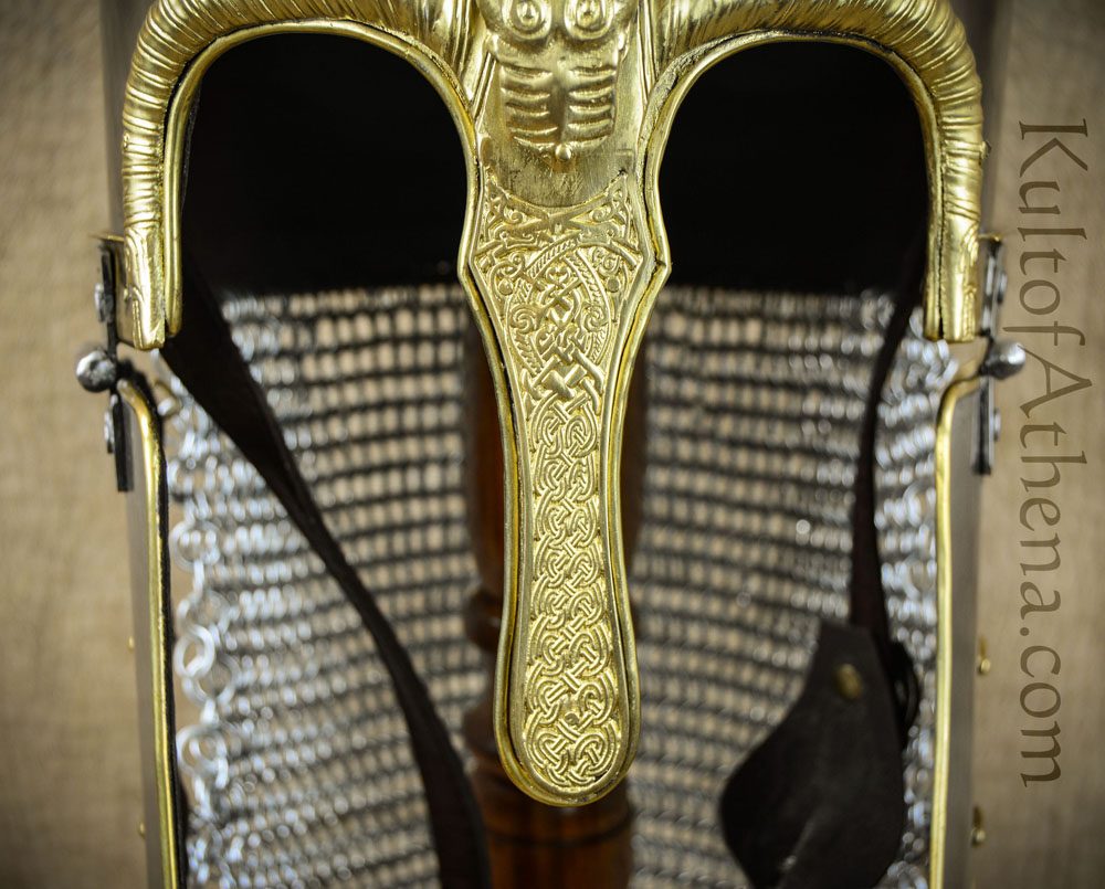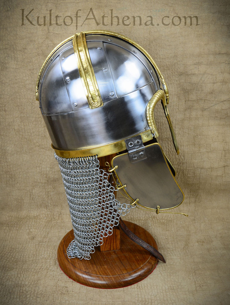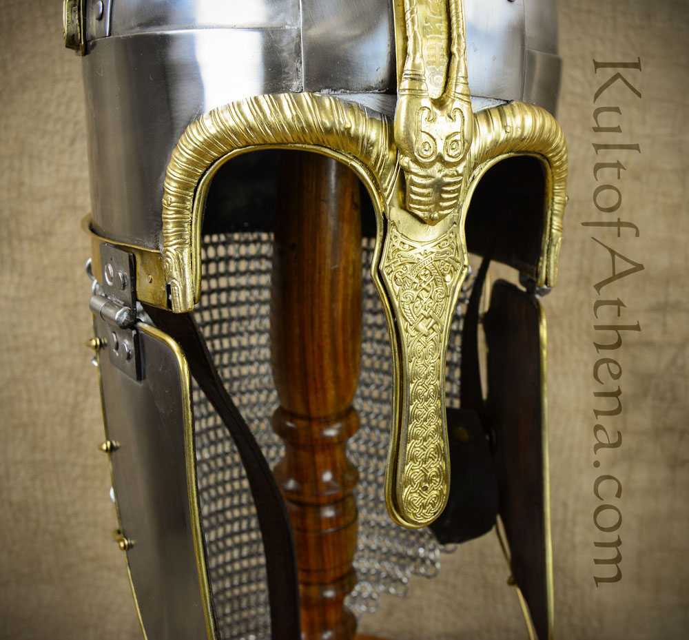 Deepeeka Coppergate Helmet I have this displayed next to the Sutton Hoo helmet by Deepeeka. On display it looks quite spectacular! However, I am a bit disappointed that the cheek guards are extremely long and make it difficult in turning the head. Also this helmet is quite large and might not suit a lot of buyers – the head has plenty of room to swim around in. It would be nice if the chain mail was riveted instead of the zinc plated mail that is offered.