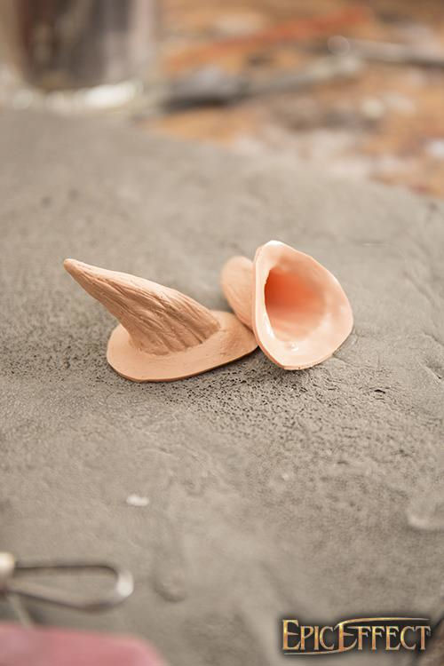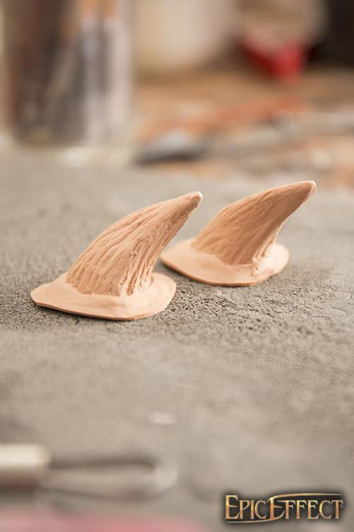 Epic Armourys Devil Horns contains two curved latex-prosthetic horns sculpted to look like demonic horns with vertical ridges. The horns are 6 cm long with a strong curve and tusk-like texture. The large contact-surfaces makes it easy to fasten and keep the horns attached for sustained periods of time. Application of this prosthetic is easy using Epic Effect Prosthetic Power Glue, Mastix Spirit Gum or other prosthetic adhesive. Use these horns for your fiendish costume, or for a character who has been afflicted with dark or infernal powers.