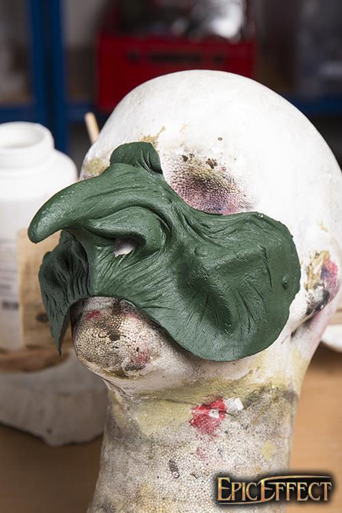 Epic Armourys Goblin Half Face is a latex prosthetic molded to create an expression suitable for a conniving goblin or witch. Designed to cover from ear to ear, this prosthetic is applied over the nose to add a sharp pointed version with large nostrils. Large contact surfaces allow for plenty of surface area in which to securely and safely glue the latex to the wearers skin.