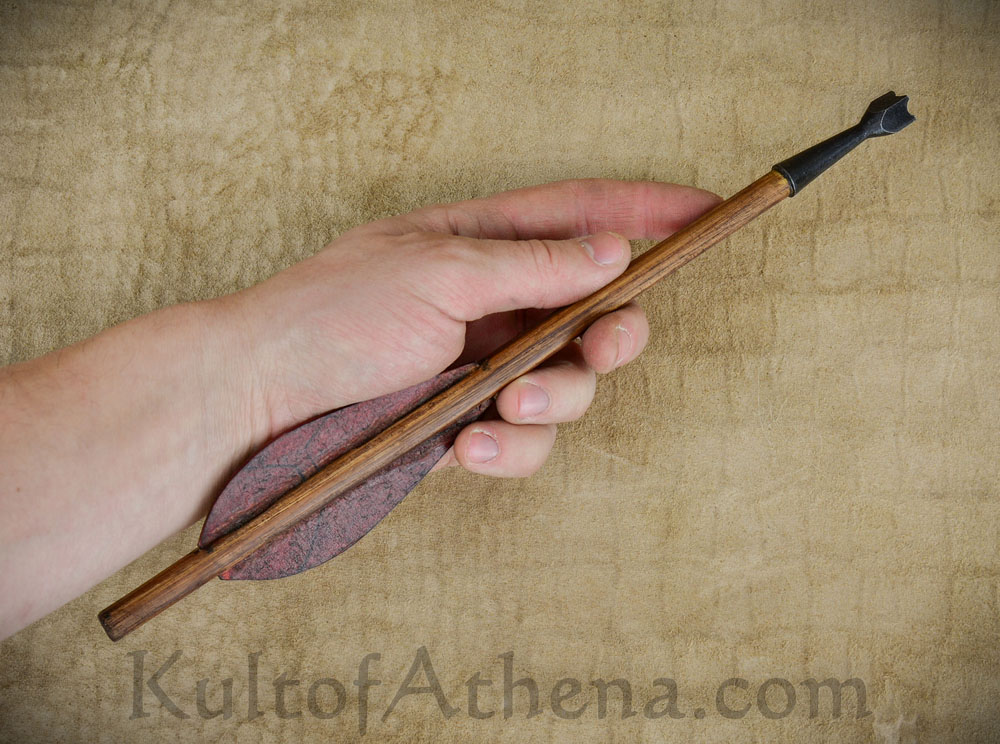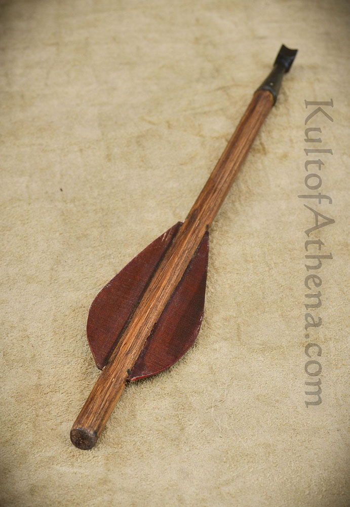This bolt has a head of blackened steel and a shaft of wood. The fletching is of leather.